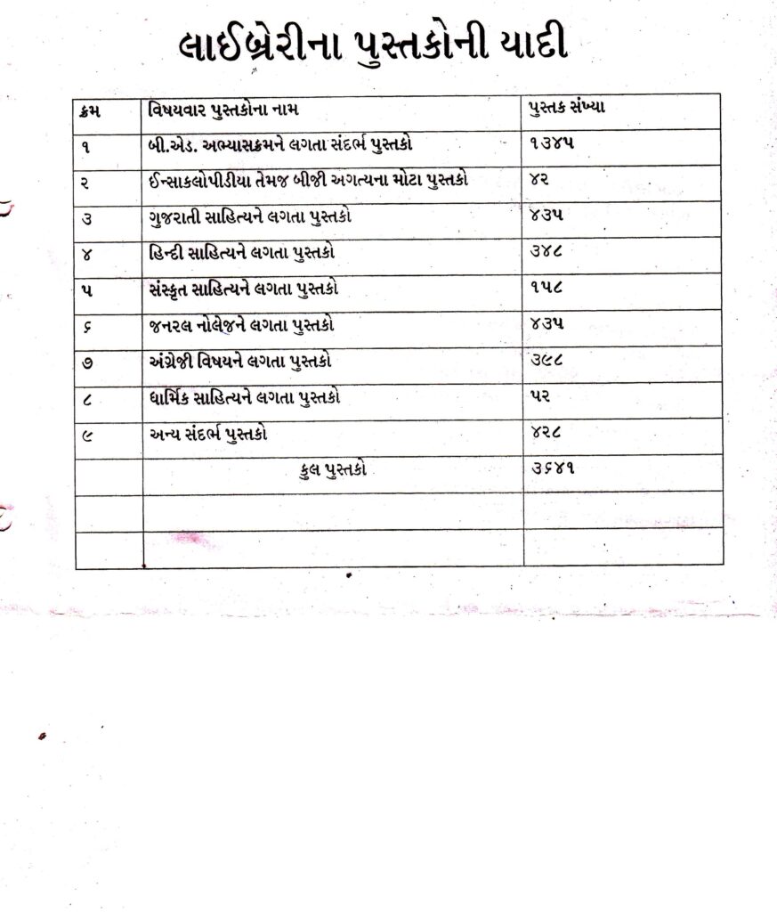 The Library facilities include 3641 Books, 10 Journals, 34 Encyclopedia and 100 Seating Capacity.